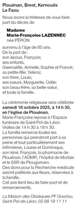 de Madame Marie-Françoise LAZENNEC née PÉRON