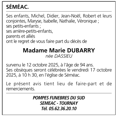 Cet espace « condoléances » est dédié à la mémoire de Madame Marie DUBARRY née DASSIEU.