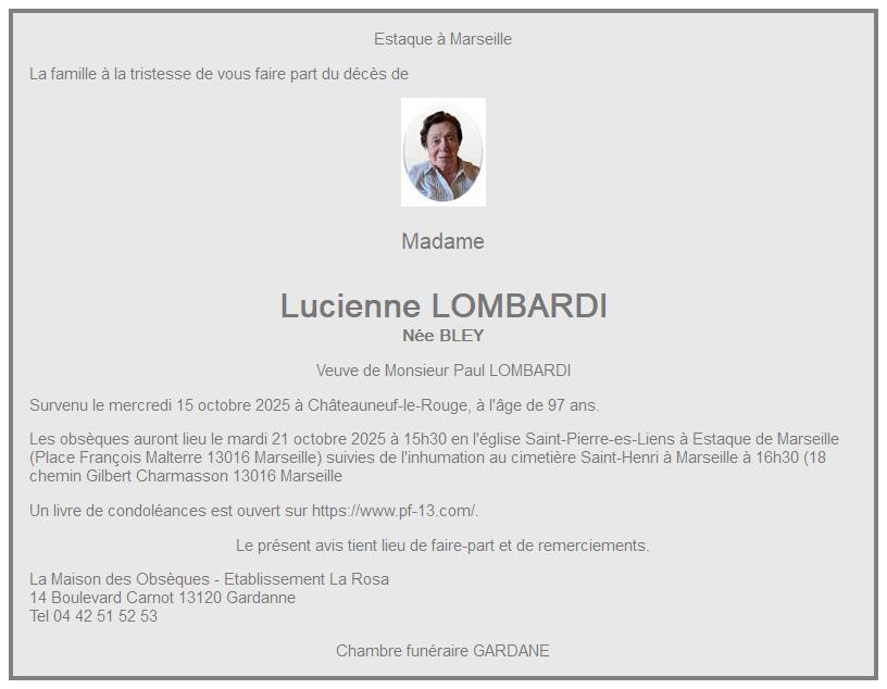 Cet espace « condoléances » est dédié à la mémoire de Madame Lucienne LOMBARDI née BLEY.