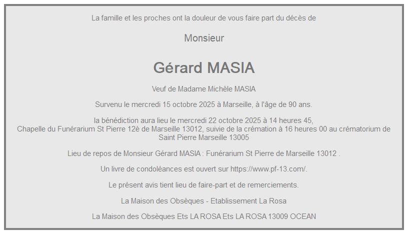 Cet espace « condoléances » est dédié à la mémoire de Monsieur Gérard MASIA.