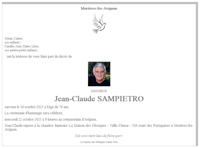 Cet espace « condoléances » est dédié à la mémoire de Monsieur Jean-Claude SAMPIETRO.