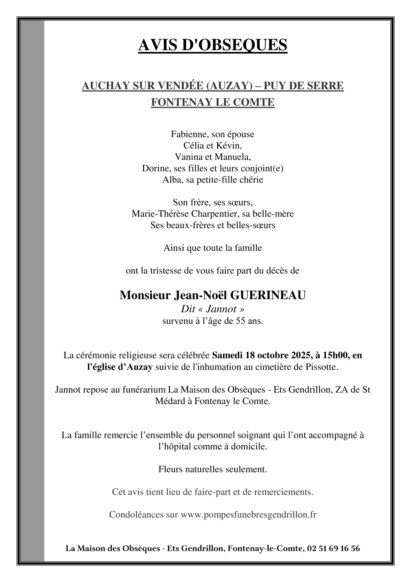 Cet espace « condoléances » est dédié à la mémoire de Monsieur Jean-Noël GUERINEAU.