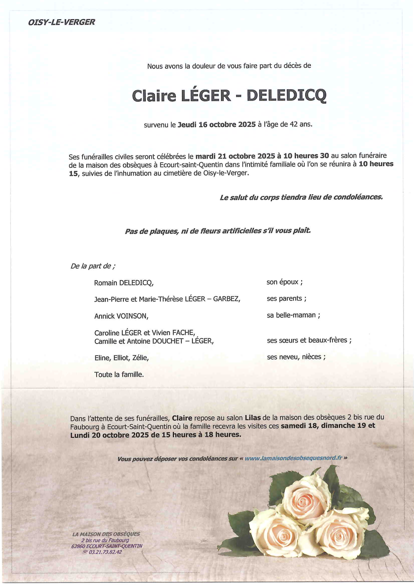 Cet espace « condoléances » est dédié à la mémoire de Madame Claire DELEDICQ née LÉGER.