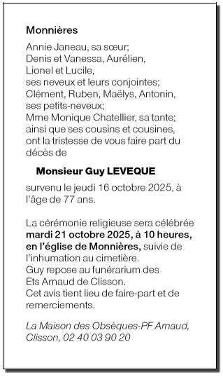 Cet espace « condoléances » est dédié à la mémoire de Monsieur Guy LEVEQUE.