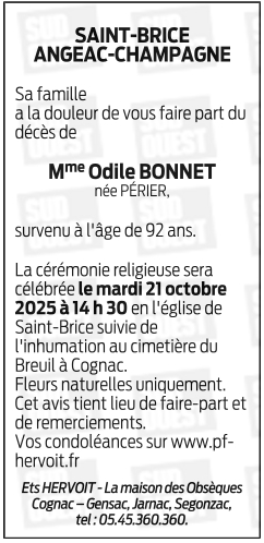 Cet espace « condoléances » est dédié à la mémoire de Madame Odile BONNET née PERIER.