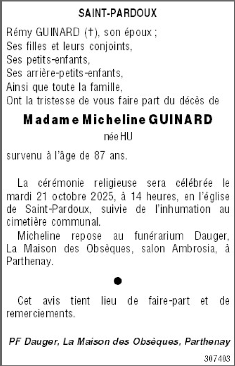 Cet espace « condoléances » est dédié à la mémoire de Madame Micheline GUINARD née HU.
