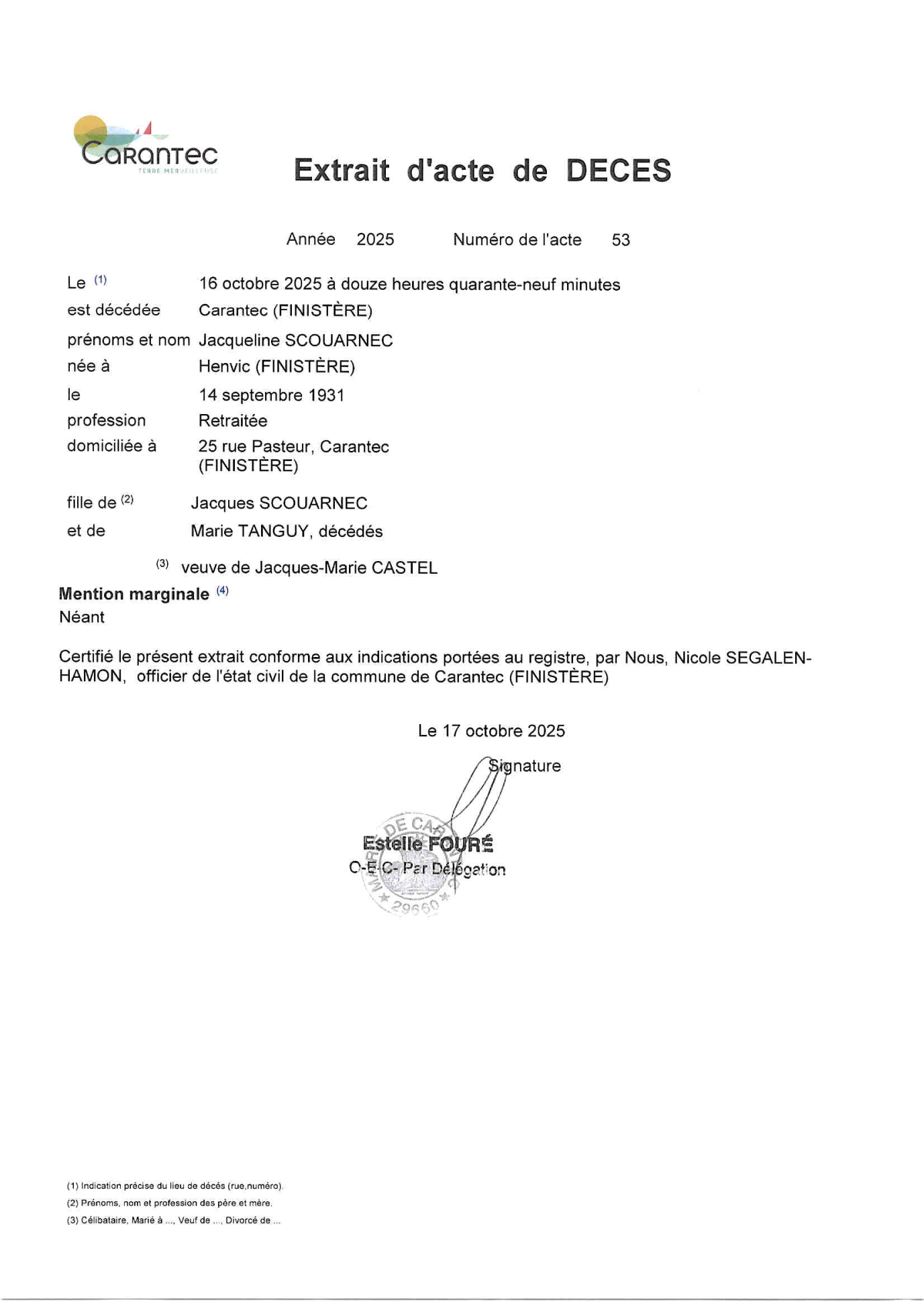 Cet espace « condoléances » est dédié à la mémoire de Madame Jacqueline SCOUARNEC.