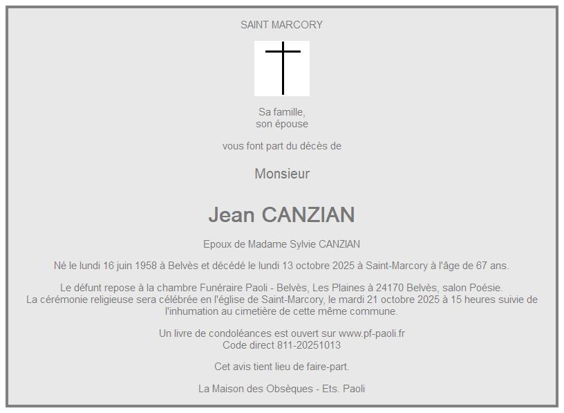 Cet espace « condoléances » est dédié à la mémoire de Monsieur Jean CANZIAN.