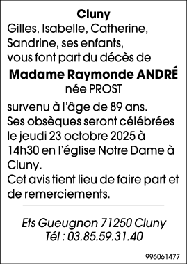 Cet espace « condoléances » est dédié à la mémoire de Madame Marie ANDRE née PROST.