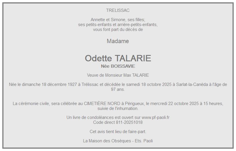 de Madame Odette TALARIE née BOISSAVIE