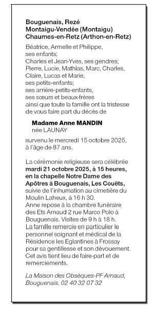Cet espace « condoléances » est dédié à la mémoire de Madame Anne MANDIN née LAUNAY.