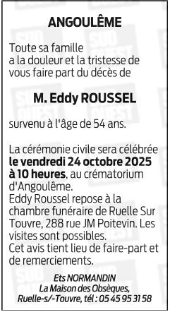 Cet espace « condoléances » est dédié à la mémoire de Monsieur Jean-Claude Eddy ROUSSEL.