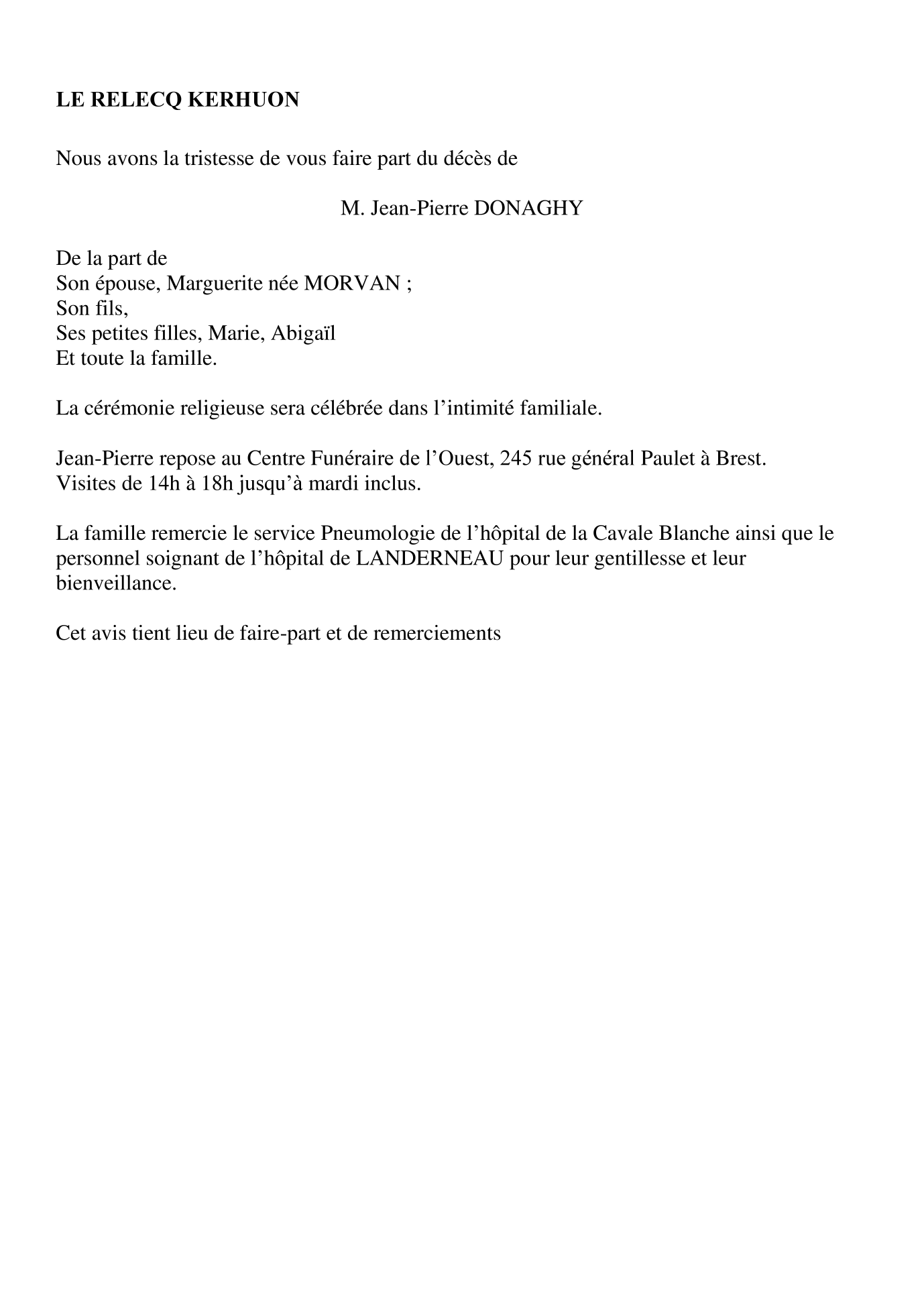 Cet espace « condoléances » est dédié à la mémoire de Monsieur Jean-Pierre DONAGHY.
