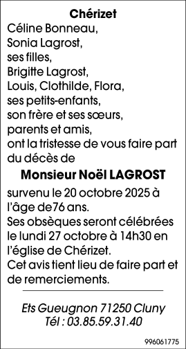 Cet espace « condoléances » est dédié à la mémoire de Monsieur Noël LAGROST.