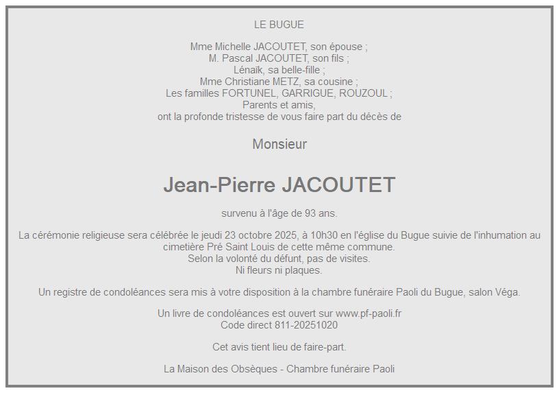 Cet espace « condoléances » est dédié à la mémoire de Monsieur Jean-Pierre JACOUTET.