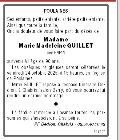 Cet espace « condoléances » est dédié à la mémoire de Madame Marie Madeleine GUILLET née GAPIN.