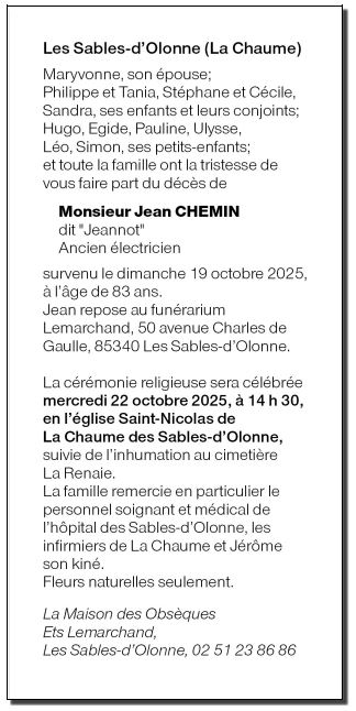 Cet espace « condoléances » est dédié à la mémoire de Monsieur Jean CHEMIN.