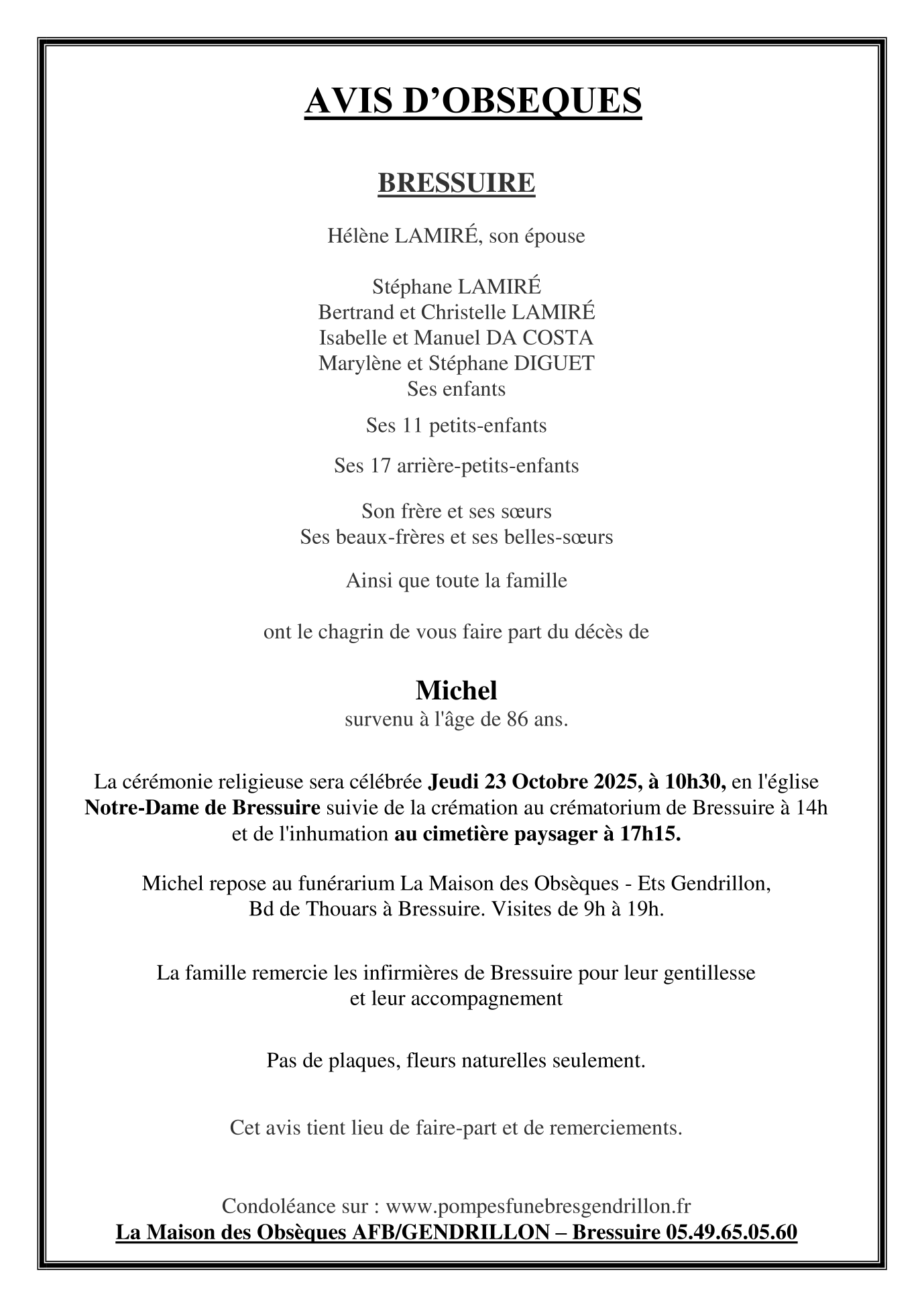 Cet espace « condoléances » est dédié à la mémoire de Monsieur Michel LAMIRÉ.