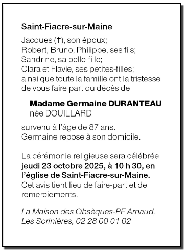 Cet espace « condoléances » est dédié à la mémoire de Madame Germaine DURANTEAU née DOUILLARD.