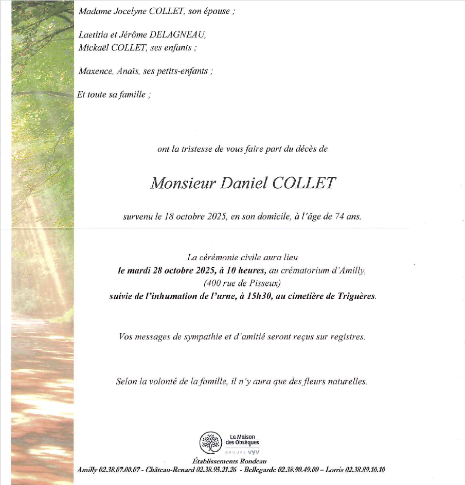Cet espace « condoléances » est dédié à la mémoire de Monsieur Daniel COLLET.