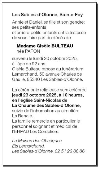 Cet espace « condoléances » est dédié à la mémoire de Madame Gisèle BULTEAU née PAPON.