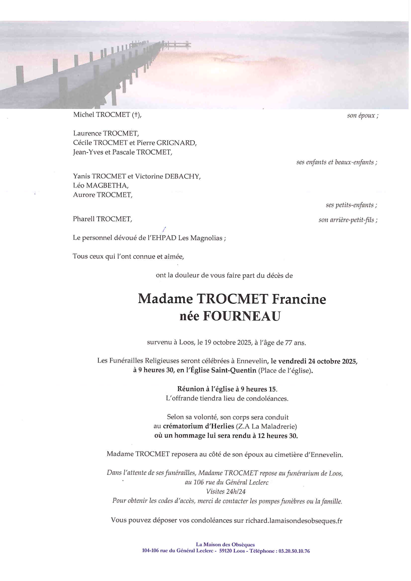 Cet espace « condoléances » est dédié à la mémoire de Madame Francine TROCMET née FOURNEAU.