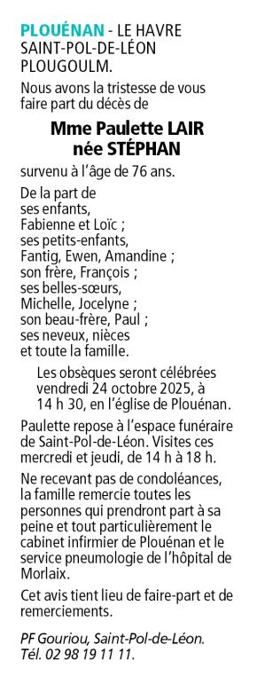 Cet espace « condoléances » est dédié à la mémoire de Madame Paulette LAIR née STÉPHAN.