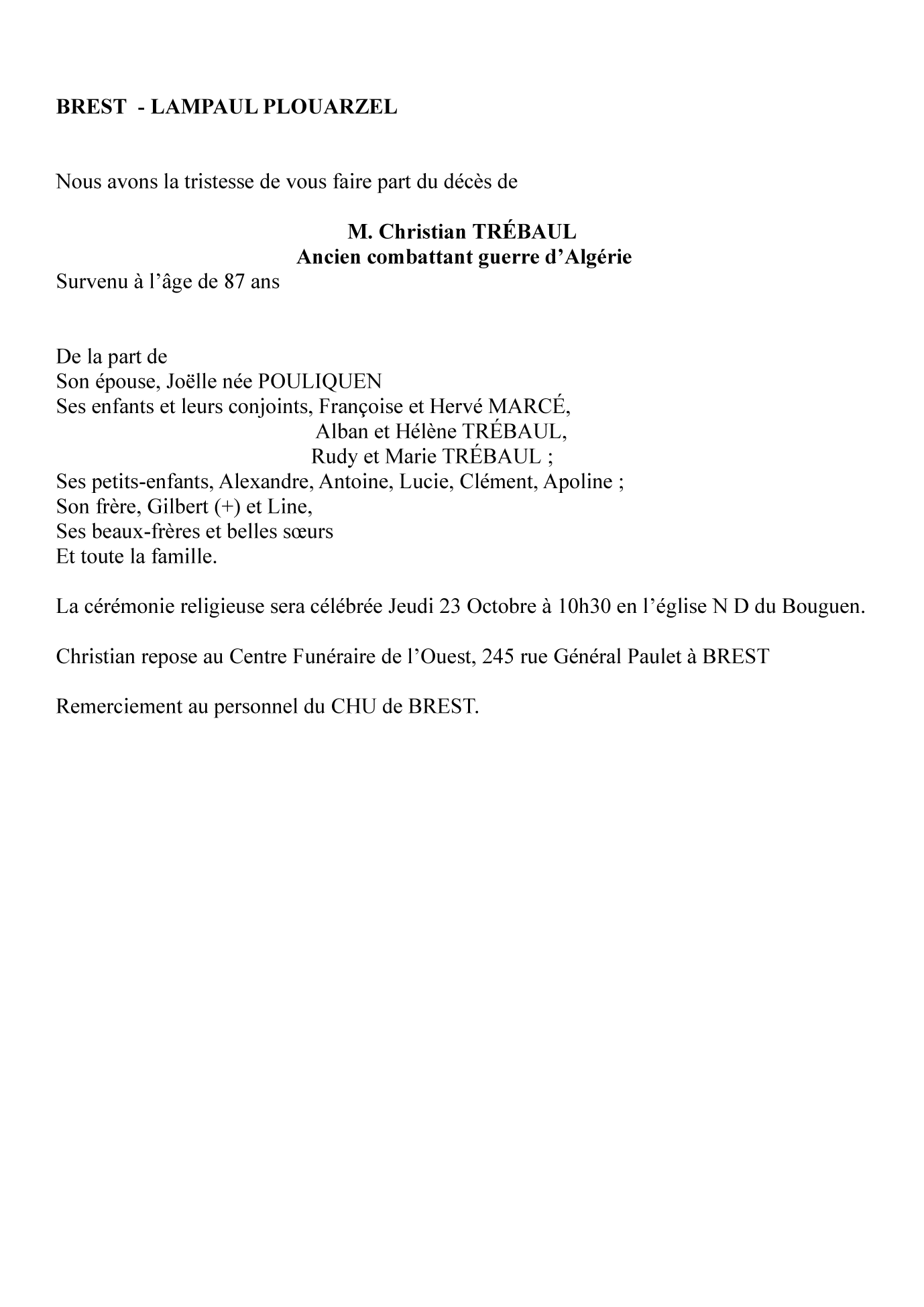 Cet espace « condoléances » est dédié à la mémoire de Monsieur Christian TREBAUL.
