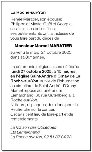 Cet espace « condoléances » est dédié à la mémoire de Monsieur Marcel MARATIER.