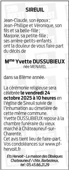 Cet espace « condoléances » est dédié à la mémoire de Madame Yvette DUSSUBIEUX née MENARD.