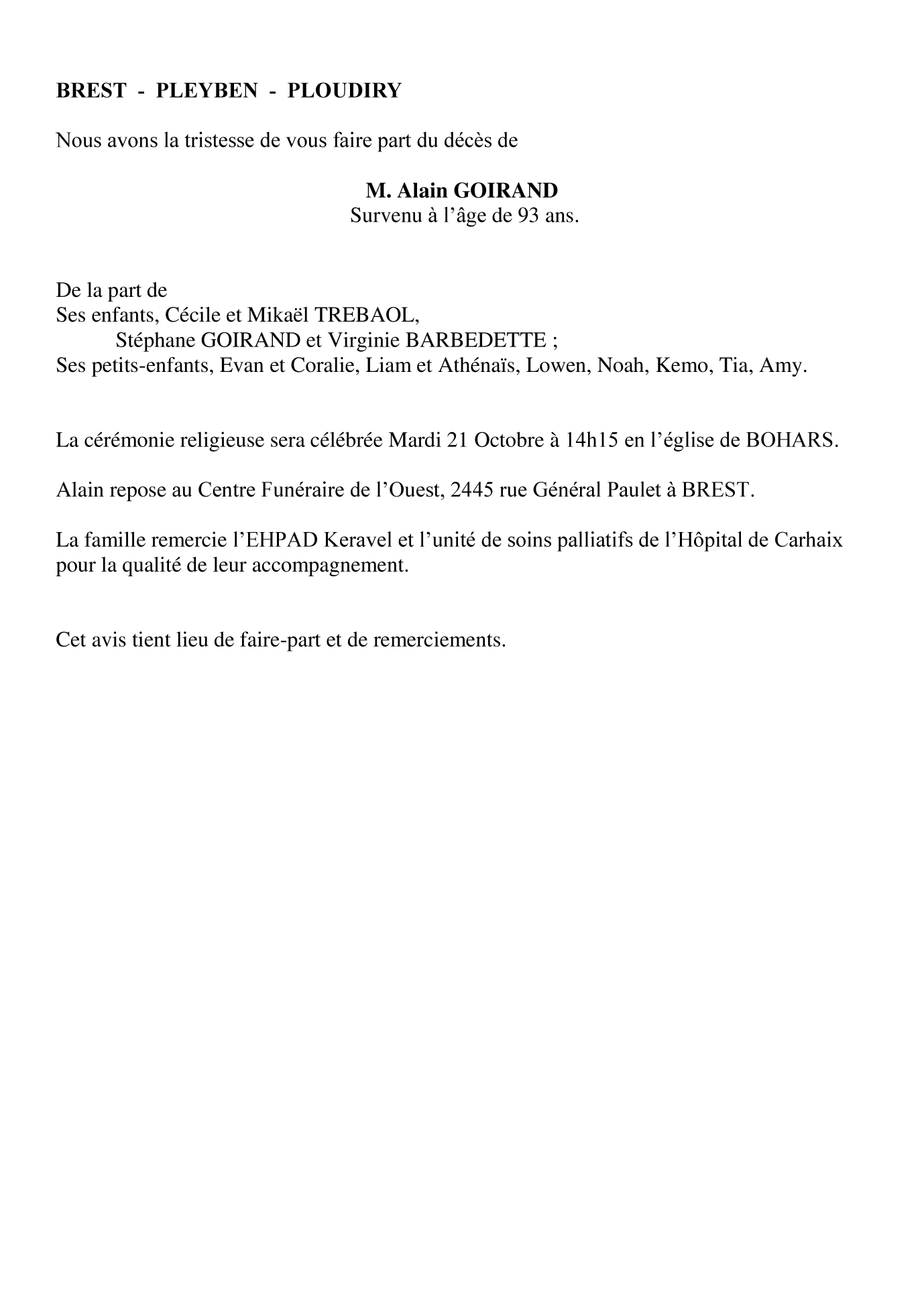 Cet espace « condoléances » est dédié à la mémoire de Monsieur Alain GOIRAND.