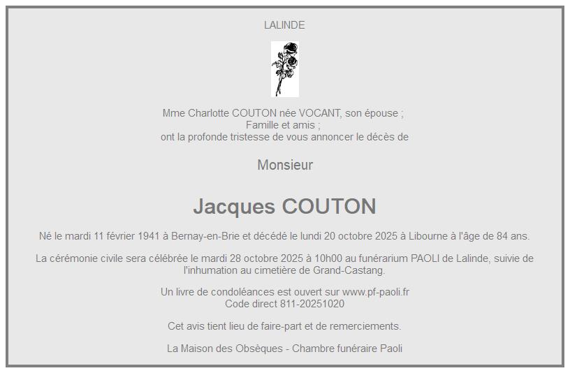 Cet espace « condoléances » est dédié à la mémoire de Monsieur Jacques COUTON.