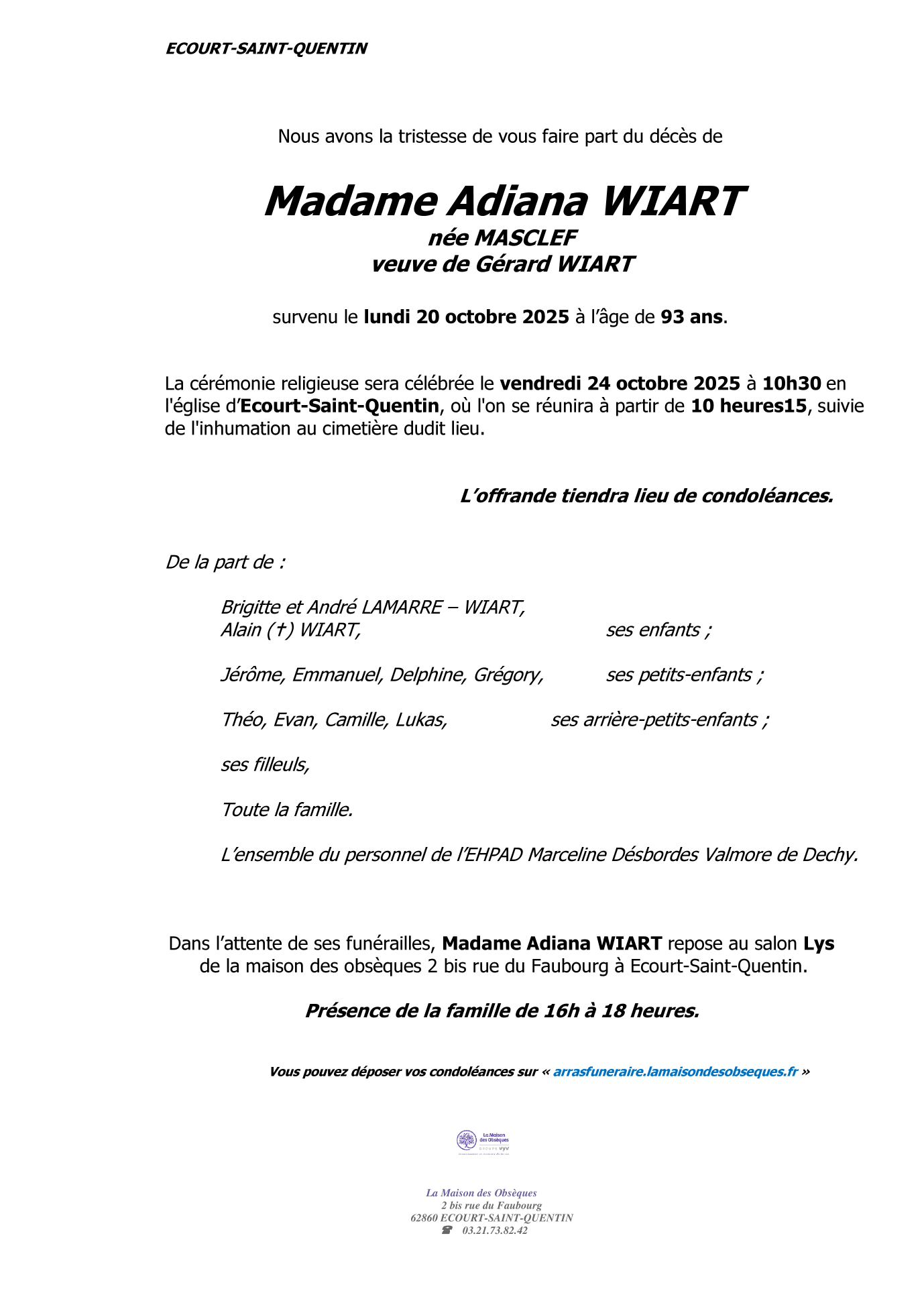 Cet espace « condoléances » est dédié à la mémoire de Madame Adiana WIART née MASCLEF.