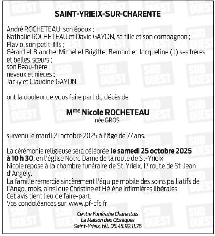 Cet espace « condoléances » est dédié à la mémoire de Madame Nicole ROCHETEAU née GROS.