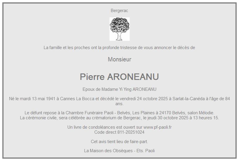 Cet espace « condoléances » est dédié à la mémoire de Monsieur Pierre ARONEANU.