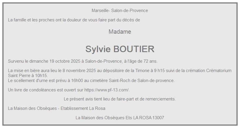 Cet espace « condoléances » est dédié à la mémoire de Madame Sylvie BOUTIER.