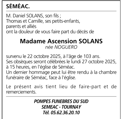 Cet espace « condoléances » est dédié à la mémoire de Madame Ascension SOLANS née NOGUERO CASASNOVAS.