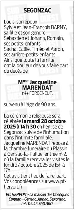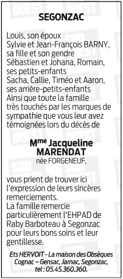 de Madame Jacqueline MARENDAT née FORGENEUF