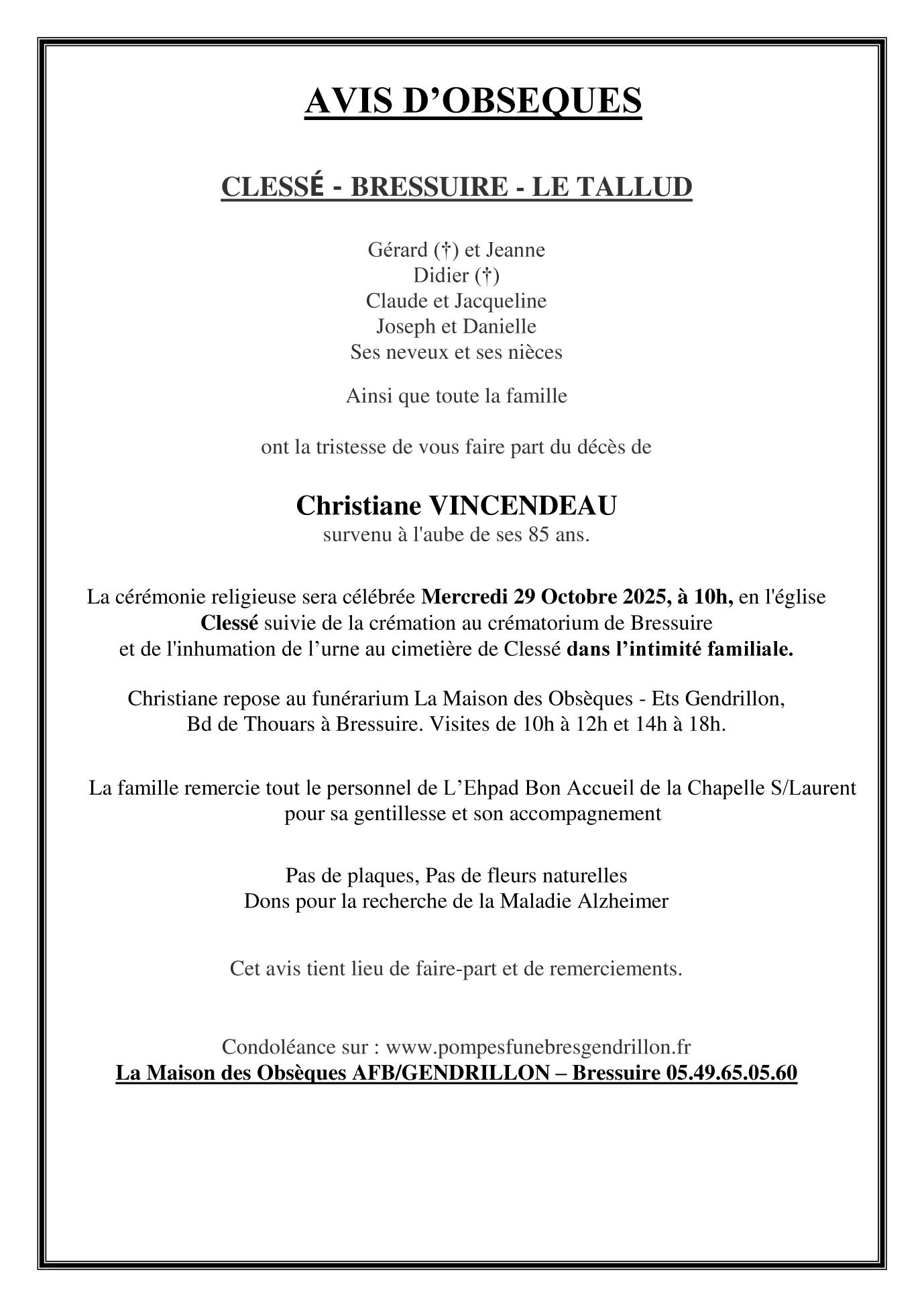 Cet espace « condoléances » est dédié à la mémoire de Madame Christiane VINCENDEAU.