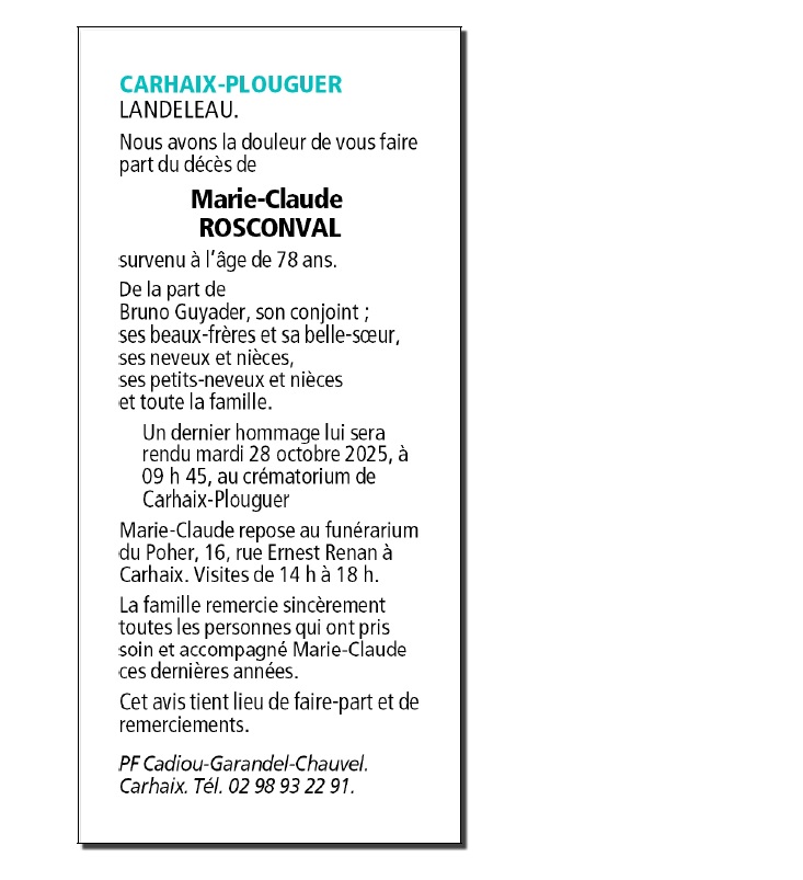 Décédée à Carhaix-Plouguer (29270) le vendredi 24 octobre 2025