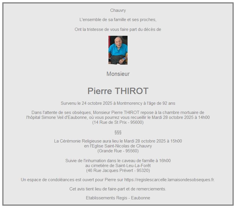 Cet espace « condoléances » est dédié à la mémoire de Monsieur Pierre THIROT.