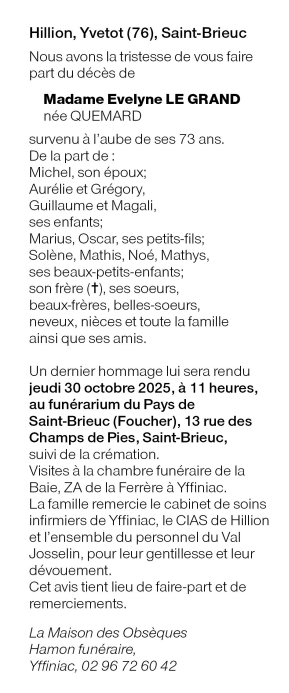 Cet espace « condoléances » est dédié à la mémoire de Madame Evelyne LE GRAND née QUÉMARD.
