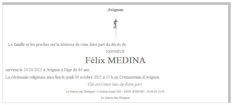Cet espace « condoléances » est dédié à la mémoire de Monsieur Félix MEDINA.