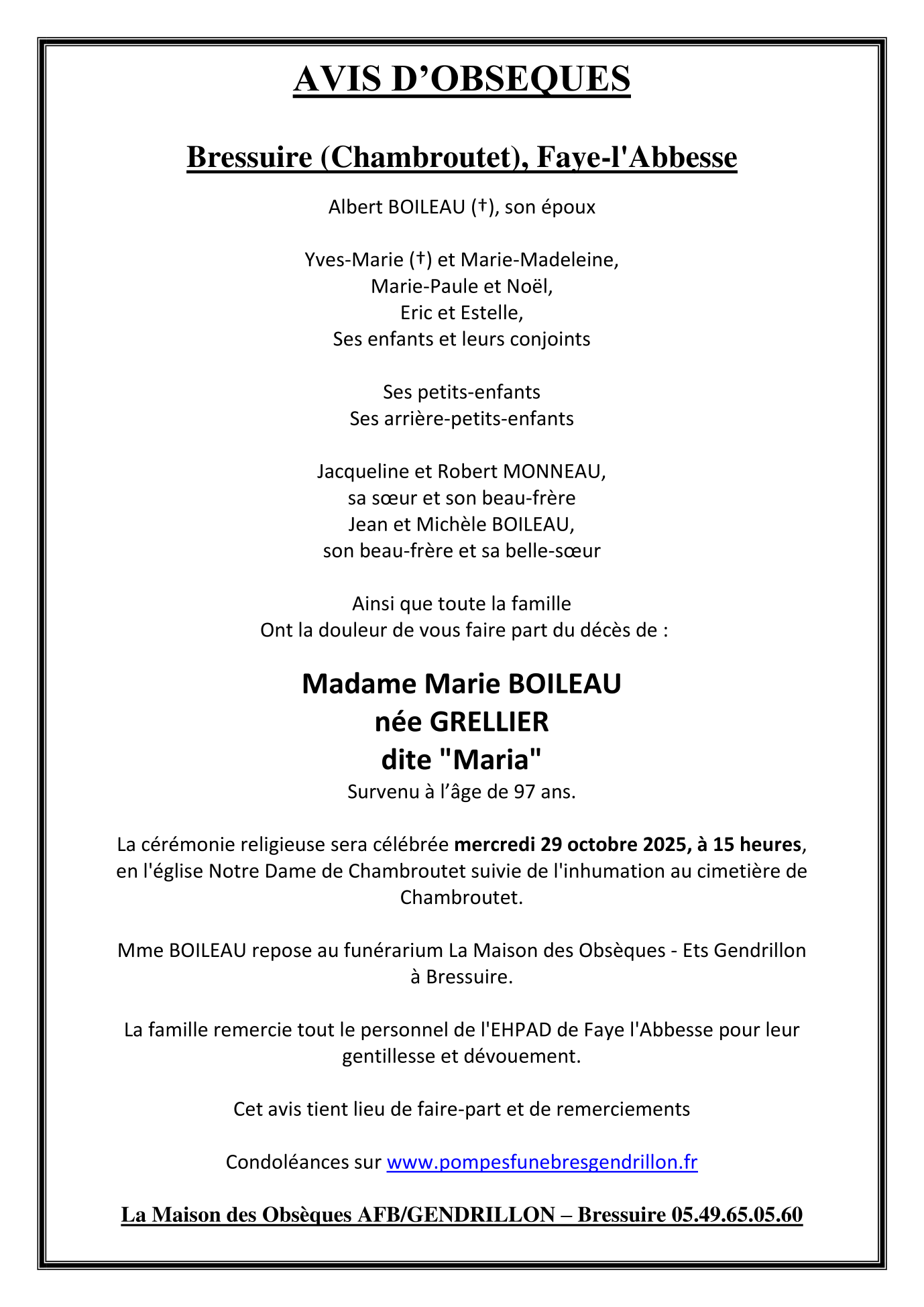 Cet espace « condoléances » est dédié à la mémoire de Madame Marie BOILEAU née GRELLIER.