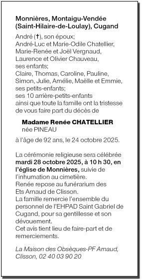 Cet espace « condoléances » est dédié à la mémoire de Madame Renée CHATELLIER née PINEAU.