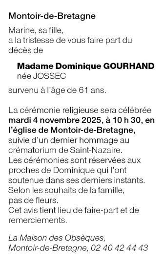 Cet espace « condoléances » est dédié à la mémoire de Madame Dominique GOURHAND née JOSSEC.