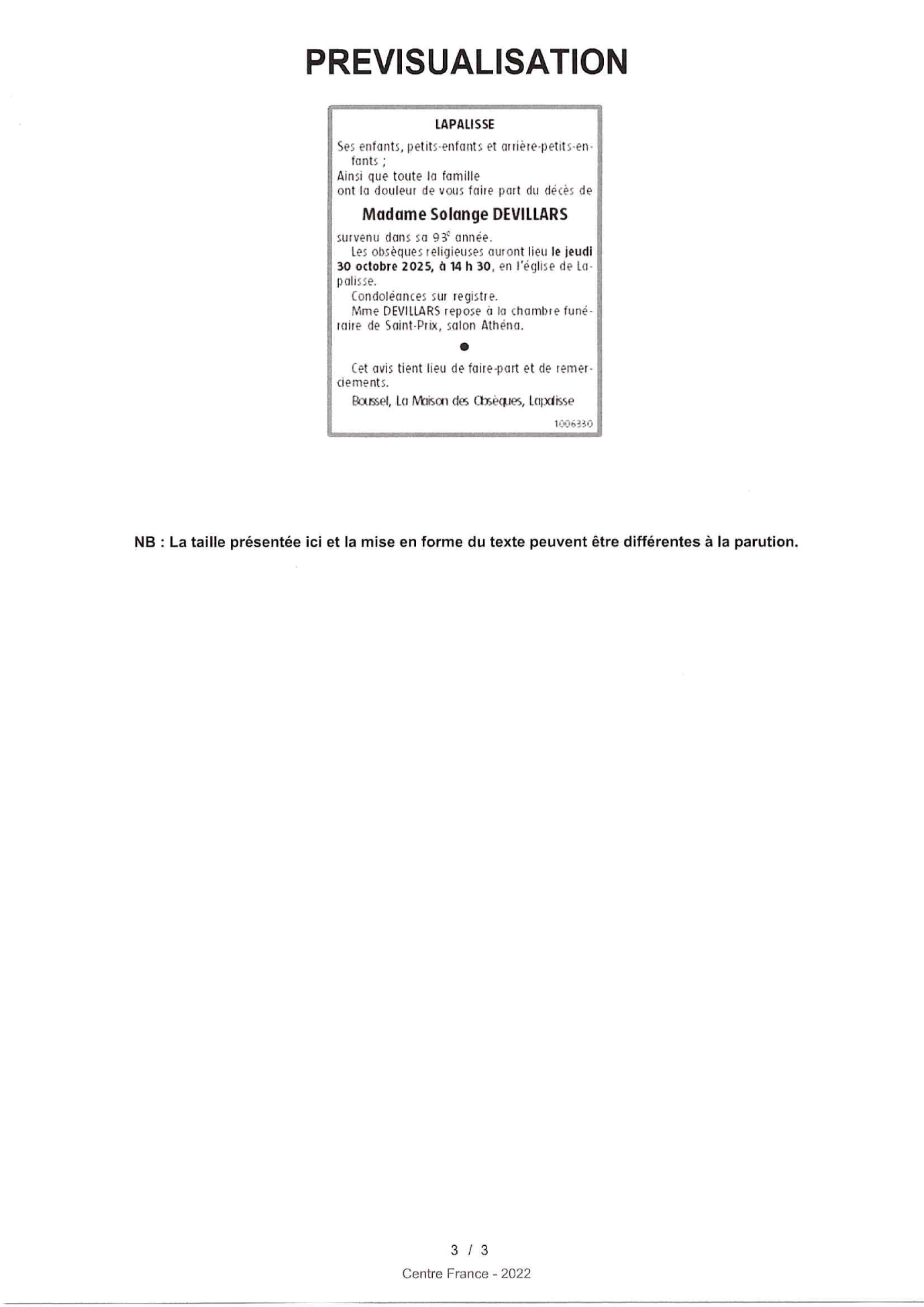 Cet espace « condoléances » est dédié à la mémoire de Madame Solange DEVILLARS née TIXIER.