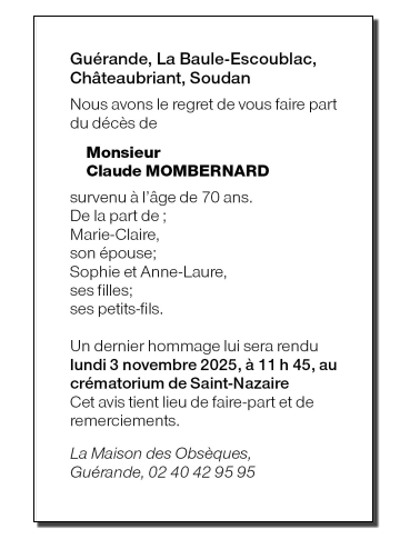 Cet espace « condoléances » est dédié à la mémoire de Monsieur Claude MOMBERNARD.