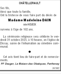 Décédée à Châtillon-sur-Thouet (79200) le samedi 25 octobre 2025