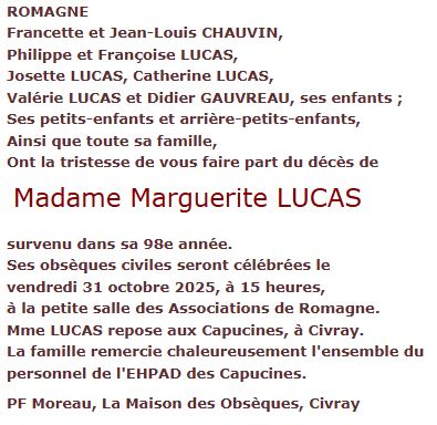 Cet espace « condoléances » est dédié à la mémoire de Madame Marguerite LUCAS.